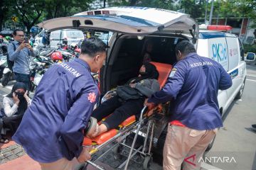Petugas kesehatan mengevakuasi warga yang pingsan saat menunggu antrean halalbihalal dengan Presiden Prabowo Subianto di pintu masuk Kementerian Sekretariat Negara, Jakarta, Sabtu (21/3/2026). Presiden Prabowo Subianto menggelar open house di Istana Kepresidenan saat Idul Fitri 1447 Hijriah untuk masyarakat umum dengan kapasitas sekitar 5.000 orang yang berlangsung pada siang hingga sore hari. ANTARA FOTO/Putra M. Akbar/nym.