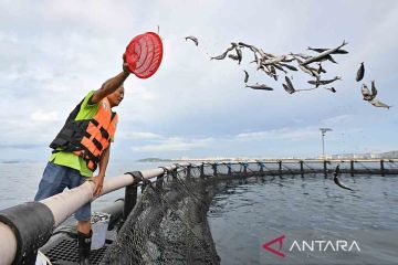 Pekerja memberi makan tuna di pangkalan pembiakan tuna sirip kuning lepas pantai di Lingshui Li, Provinsi Hainan, China, Rabu (17/9/2025). Dengan terobosan teknologi, Akademi Ilmu Perikanan China membangun pangkalan pembiakan tuna sirip kuning lepas pantai di Lingshui, yang telah mencapai pemijahan dan penetasan buatan tuna sirip kuning. ANTARA FOTO/Xinhua/Guo Cheng/rwa.