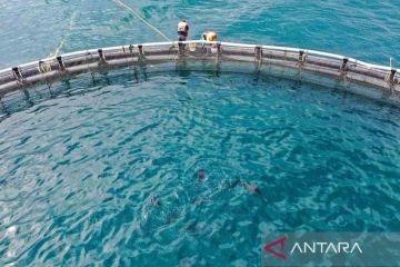 Foto udara seorang pekerja memberi makan tuna di pangkalan pembiakan tuna sirip kuning lepas pantai di Lingshui Li, Provinsi Hainan, China, Rabu (17/9/2025). Dengan terobosan teknologi, Akademi Ilmu Perikanan China membangun pangkalan pembiakan tuna sirip kuning lepas pantai di Lingshui, yang telah mencapai pemijahan dan penetasan buatan tuna sirip kuning. ANTARA FOTO/Xinhua/Guo Cheng/rwa.