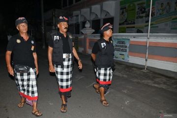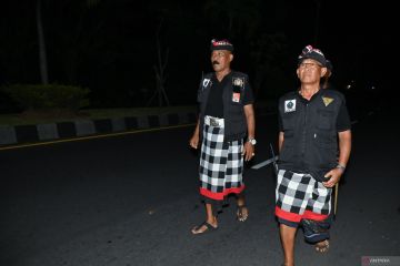 Pecalang atau petugas keamanan adat Bali berpatroli saat Hari Raya Nyepi Tahun Saka 1948 di wilayah Desa Adat Tuban, Badung, Bali, Kamis (19/3/2026) malam. Patroli itu dilakukan untuk menjaga keamanan dan ketertiban wilayah termasuk untuk memastikan seluruh penerangan di permukiman warga dan tempat usaha telah dipadamkan selama umat Hindu menjalani Catur Brata Penyepian hingga Jumat (20/3) pukul 06.00 WITA. ANTARA FOTO/Fikri Yusuf/wsj.
