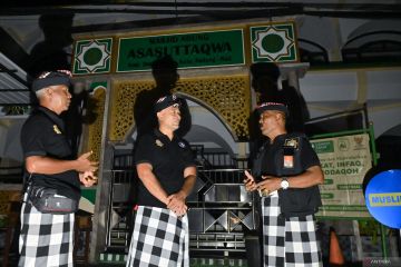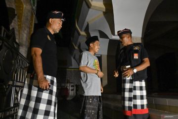 Pecalang atau petugas keamanan adat Bali berbincang dengan marbut Masjid Agung Asasuttaqwa saat melakukan patroli pada Hari Raya Nyepi Tahun Saka 1948 di Desa Adat Tuban, Badung, Bali, Kamis (19/3/2026) malam. Patroli itu dilakukan untuk menjaga keamanan dan ketertiban wilayah termasuk untuk memastikan seluruh penerangan di permukiman warga dan tempat usaha telah dipadamkan selama umat Hindu menjalani Catur Brata Penyepian hingga Jumat (20/3) pukul 06.00 WITA. ANTARA FOTO/Fikri Yusuf/wsj.