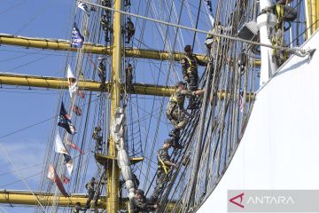 KRI Bima Suci-945 bersiap bertolak menuju Padang dalam rangka pelaksanaan latihan praktek pelayaran Kartika Jala Krida (KJK) 2025 Taruna Akademi TNI AL (AAL) Angkatan ke-72 di Dermaga Kolinlamil, Jakarta, Rabu (6/8/2025). Pelayaran tersebut juga diikuti peserta ASEAN Plus Cadet Sail (APCS) yang terdiri dari 38 perwakilan taruna dan junior officer serta 16 perwira pendamping dari 9 negara ASEAN dan 11 negara mitra ASEAN. ANTARA FOTO/Muhammad Adimaja/bar
