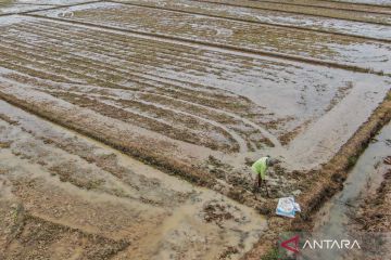 Foto udara petani membuat pematang pada areal persawahan di Desa Onewila, Kabupaten Konawe Selatan, Kamis (30/10/2025). Pemprov Sulawesi Tenggara membentuk 33 brigade pangan yang terdiri dari pemilik lahan dan anggota dengan berbagai keahlian hingga mekanik untuk mengelola lahan sawah baru seluas 6.745 hektare hasil program Cetak Sawah Baru (CSR) Kementerian Pertanian di wilayah itu. ANTARA FOTO/Andry Denisah/nz