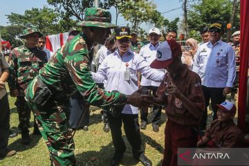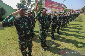Prajurit Satuan Tugas (Satgas) TNI Manunggal Membangun Desa (TMMD) mengikuti upacara pembukaan TMMD Sengkuyung tahap IV di Lapangan Karangtoro, Semarang, Jawa Tengah, Rabu (8/10/2025). Program TMMD yang akan dilaksanakan selama 30 hari yang meliputi pekerjaan fisik dan non fisik seperti pembangunan infrastruktur, penyuluhan pertanian, penyuluhan radikalisme dan terorisme hingga penyuluhan narkoba itu untuk membantu mempercepat pembangunan dan kesejahteraan masyarakat serta terciptanya kemanunggalan TNI bersama rakyat. ANTARA FOTO/Makna Zaezar/nz