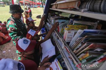 Prajurit Satuan Tugas (Satgas) TNI Manunggal Membangun Desa (TMMD) mendampingi siswa memilih buku di mobil perpustakaan keliling dalam program TMMD Sengkuyung tahap IV di Lapangan Karangtoro, Semarang, Jawa Tengah, Rabu (8/10/2025). Program TMMD yang akan dilaksanakan selama 30 hari yang meliputi pekerjaan fisik dan non fisik seperti pembangunan infrastruktur, penyuluhan pertanian, penyuluhan radikalisme dan terorisme hingga penyuluhan narkoba itu untuk membantu mempercepat pembangunan dan kesejahteraan masyarakat serta terciptanya kemanunggalan TNI bersama rakyat. ANTARA FOTO/Makna Zaezar/nz
