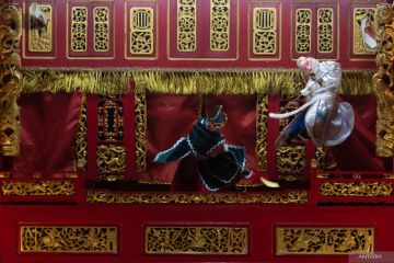 Dalang dari kelompok seni Sanggar Siauw Pek San menampilkan sejumlah boneka lakon saat pementasan Kelana Wayang Potehi Cap Cip Cup Fest di Tjap Sahabat, Bandung, Jawa Barat, Kamis (15/1/2026). Pementasan tersebut sebagai perjalanan merawat dan melestarikan tradisi seni boneka tangan yang berasal dari Tiongkok Selatan yang telah ada sejak abad ke-17 di Indonesia sebagai simbol sejarah, toleransi budaya dan pembauran masyarakat Indonesia. ANTARA FOTO/Novrian Arbi/YU