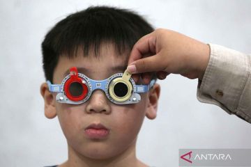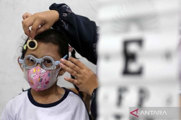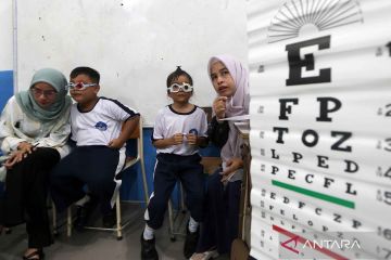 Pelajar Sekolah Dasar Methodist memeriksa mata pada bakti sosial HUT Perhimpunan Dokter Spesialis Mata Indonesia (Perdami) di Banda Aceh, Aceh, Sabtu (2/8/2025). Perdami memperkirakan 10 persen dari 66 juta anak sekolah berusia antara lima hingga 19 tahun di seluruh Indonesia mengalami kelainan refraksi dan hanya sebagian kecil yang tertangani dengan penggunaan kacamata. ANTARA FOTO/Irwansyah Putra/YU