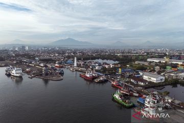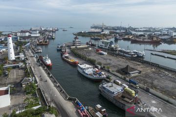 Foto udara deretan kapal bersandar di Pelabuhan Tanjung Emas, Semarang, Jawa Tengah, Jumat (7/11/2025). Menteri Koordinator Bidang Infrastruktur dan Pembangunan Kewilayahan, Agus Harimurti Yudhoyono (AHY), menargetkan kontribusi sektor maritim terhadap Produk Domestik Bruto (PDB) nasional dari 8,1 persen pada 2025 menjadi 9,1 persen pada 2029, melalui peningkatan kapasitas dan efisiensi pelabuhan utama serta penguatan jaringan tol laut yang menjadi tulang punggung logistik nasional. ANTARA FOTO/Aprillio Akbar/agr