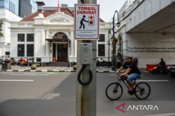 Pengendara melintas di samping tombol darurat (Panic Button) yang dipasang di Jalan Asia Afrika, Bandung, Jawa Barat, Kamis (20/11/2025). Pemerintah Kota Bandung menghadirkan Panic Button di dua titik ruang publik strategis yang memiliki fitur komunikasi antara warga dengan petugas Bandung Siaga 112 untuk melaporkan situasi mendesak seperti kecelakaan, kondisi medis kritis, hingga tindak kriminal berat. ANTARA FOTO/Raisan Al Farisi/rwa.