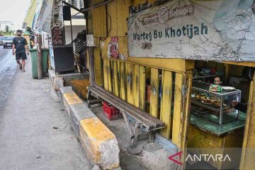 Pedagang berada di warung nasi yang mengalami penurunan muka tanah di Jalan Muara Baru Ujung, Penjaringan, Jakarta, Kamis (8/1/2026). Badan Riset dan Inovasi Nasional (BRIN) mencatat rata-rata penurunan tanah di Jakarta bagian utara terjadi sekitar 3,5 sentimeter per tahun yang berkontribusi meningkatkan risiko banjir Jakarta hingga lebih dari 40 persen sehingga perlu langkah mitigasi terutama dengan memberhentikan penggunaan air tanah. ANTARA FOTO/Sulthony Hasanuddin/rwa.