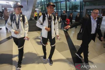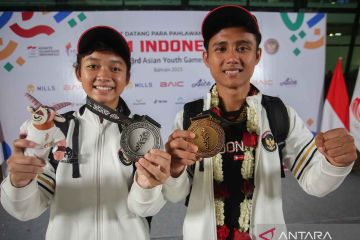 Dua atlet pencak silat Indonesia peraih medali emas Furgon Habbil Winata(kanan) dan peraih medali perak Qiken Dwi Tata Olifia (kiri) menunjukkan medali setibanya dari Bahrain di Terminal 3 Bandara Soekarno Hatta, Tangerang, Banten, Rabu (22/10/2025). Pencak silat Indonesia menorehkan sejarah gemilang di Asian Youth Games (AYG) Bahrain 2025 dengan mempersembahkan medali emas pertama bagi tim Indonesia dan menjadi medali emas pertama pencak silat di ajang AYG yang diraih Furgon Habbil Winata di kelas 51-55 kg putra dan medali perak oleh Qiken Dwi Tata Olifia. ANTARA FOTO/Muhammad Iqbal/YU