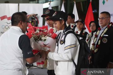 Asdep Olahragawan Elit Kementerian Olahraga Budi Ariyanto Musli (kiri) memberikan karangan bunga kepada dua atlet pencak silat Indonesia peraih medali emas Furgon Habbil Winata (kedua kiri) dan peraih medali perak Qiken Dwi Tata Olifia (kanan) setibanya dari Bahrain di Terminal 3 Bandara Soekarno Hatta, Tangerang, Banten, Rabu (22/10/2025). Pencak silat Indonesia menorehkan sejarah gemilang di Asian Youth Games (AYG) Bahrain 2025 dengan mempersembahkan medali emas pertama bagi tim Indonesia dan menjadi medali emas pertama pencak silat di ajang AYG yang diraih Furgon Habbil Winata di kelas 51-55 kg putra dan medali perak oleh Qiken Dwi Tata Olifia. ANTARA FOTO/Muhammad Iqbal/YU