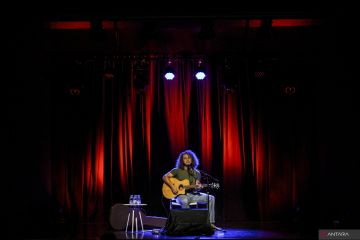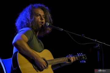Penyanyi Boaz Roelevink membawakan lagu saat tampil dalam konser di Pusat Kebudayaan Belanda Erasmus Huis, Jakarta, Sabtu (25/10/2025). Penyanyi kelahiran Belanda itu tampil membawakan lagu-lagunya di album Keep It Simple seperti Gambling With Love dan Lovestreet 55 dengan genre folk. ANTARA FOTO/Hafidz Mubarak A/foc.