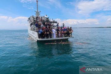 Prajurit TNI AL melaksanakan tabur bunga dari atas KAL Sembulungan 11-5-42 di Selat Bali, Banyuwangi, Jawa Timur, Senin (10/11/2025). Memperingati Hari Pahlawan 2025, TNI AL bersama Forkopimda setempat melaksanakan tabur bunga di laut untuk mengenang jasa para pahlawan yang telah gugur. ANTARA FOTO/Budi Candra Setya/nym.