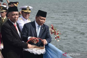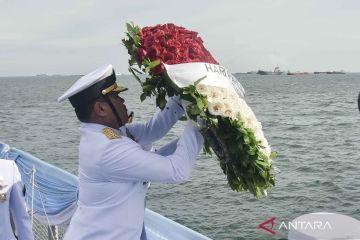 Kepala Staf Angkatan Laut Laksamana TNI Muhammad Ali melemparkan karangan bunga ke laut pada peringatan Hari Pahlawan di KRI-320 Brawijaya, di Perairan Teluk Jakarta, Senin (10/11/2025). TNI Angkatan Laut menggelar upacara tabur bunga di laut Teluk Jakarta dalam rangka memperingati Hari Pahlawan Nasional 2025 dengan tema pahlawanku teladanku terus bergerak melanjutkan perjuangan. ANTARA FOTO/Fakhri Hermansyah/nym.
