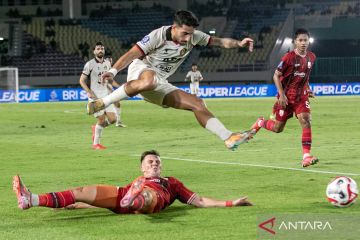 Pesepak bola Persik Kediri Ernesto Gomez Munoz (atas) berebut bola dengan pesepak bola Persis Solo Roman Paparyha (bawah) pada pertandingan BRI Super League 2025-2026 di Stadion Manahan, Solo, Jawa Tengah, Minggu (1/3/2026). Pada pertandingan tersebut Persis Solo menang atas Persik Kediri dengan skor 2-1. ANTARA FOTO/Mohammad Ayudha/sgd