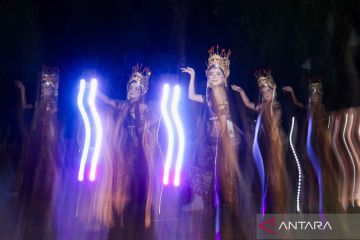 Sejumlah penari menampilkan tarian gandrung Jajang pada acara Purna Candra di Papring, Kalipuro, Banyuwangi, Jawa Timur, Selasa (6/1/2026) malam. Aktualisasi seni seperti teaterikal, wayang dan tari-tarian tersebut selain menjadi tradisi masyarakat Papring dalam menyambut bulan purnama, juga sebagai ajang kreativitas melestarikan kesenian tradisional. ANTARA FOTO/ Budi Candra Setya/YU