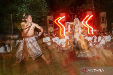Sejumlah seniman menampilkan drama teaterikal pada acara Purna Candra di Papring, Kalipuro, Banyuwangi, Jawa Timur, Selasa (6/1/2026) malam. Aktualisasi seni seperti teaterikal, wayang dan tari-tarian tersebut selain menjadi tradisi masyarakat Papring dalam menyambut bulan purnama, juga sebagai ajang kreativitas melestarikan kesenian tradisional. ANTARA FOTO/ Budi Candra Setya/YU