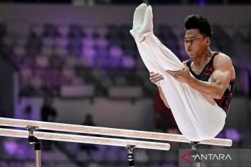 Pesenam putra Indonesia Abiyu Rafi tampil dalam nomor palang sejajar pada Kejuaraan Dunia Gimnastik 2025 di Indonesia Arena, Jakarta, Senin (20/10/2025). Pesenam putra Indonesia gagal lolos ke putaran final All-Around pada Kejuaraan Dunia Gimnastik 2025 dengan rincian Abiyu Rafi berada di posisi 48 dengan 69,197 poin, Satria Tri Yudha di posisi 65 dengan 46,498 poin, Agung Suci Akbar di posisi 238 dengan 11,133 poin, Joseph Judah Hatoguan di posisi 246 dengan 08,00 poin, sedangkan Muhammad Aprizal harus absen bertanding karena sakit. ANTARA FOTO/Fauzan/nym.