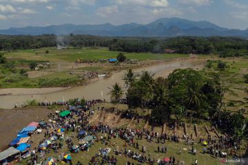 Foto udara keramaian penonton menyaksikan pesta rakyat Kuluwung Sunda di Desa Jagatamu, Cariu, Kabupaten Bogor, Jawa Barat, Senin (23/3/2026). Pesta Rakyat yang diselenggarakan setelah Lebaran di area dekat sungai Cipamingkis, Bogor tersebut sebagai ajang silaturahim antar kampung serta sebagai pelestarian budaya asli Sunda dan hiburan rakyat. ANTARA FOTO/Yulius Satria Wijaya/foc.