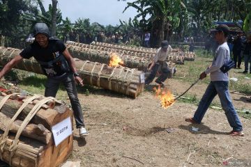 Sejumlah peserta menyalakan Kuluwung (meriam karbit) saat pesta rakyat Kuluwung Sunda di Desa Jagatamu, Cariu, Kabupaten Bogor, Jawa Barat, Senin (23/3/2026). Pesta Rakyat yang diselenggarakan setelah Lebaran di area dekat sungai Cipamingkis, Bogor tersebut sebagai ajang silaturahim antar kampung serta sebagai pelestarian budaya asli Sunda dan hiburan rakyat. ANTARA FOTO/Yulius Satria Wijaya/foc.