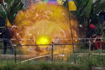 Peserta menyalakan Kuluwung (meriam karbit) saat pesta rakyat Kuluwung Sunda di Desa Jagatamu, Cariu, Kabupaten Bogor, Jawa Barat, Senin (23/3/2026). Pesta Rakyat yang diselenggarakan setelah Lebaran di area dekat sungai Cipamingkis, Bogor tersebut sebagai ajang silaturahim antar kampung serta sebagai pelestarian budaya asli Sunda dan hiburan rakyat. ANTARA FOTO/Yulius Satria Wijaya/foc.