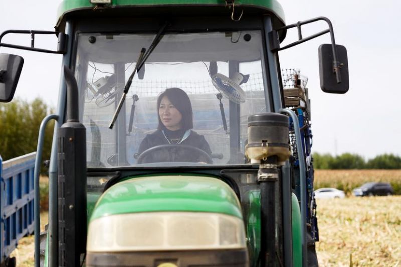 Han Fengxiang memeriksa mesin pertanian di lapangan di Kabupaten Lishu, timur laut Provinsi Jilin, Cina, 9 Oktober 2025 . ANTARA/Xinhua/Yan Linyun