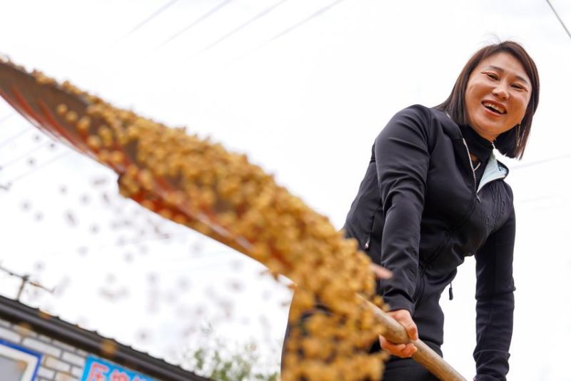 Han Fengxiang mengeringkan kedelai yang baru dipanen di koperasinya di Kabupaten Lishu, Provinsi Jilin, China timur laut, 9 Oktober 2025. ANTARA/Xinhua/Yan Linyun