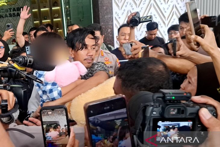 Ayah anak korban, Dwi Nurmas (tengah) mengendong anaknya Bilqis usai penyerahan usai diselamatkan dari Provinsi Jambi atas kasus penculikan, di Kantor Mapolrestabes Makassar, Sulawesi Selatan, Minggu (9/11/2025). ANTARA/Darwin Fatir.Kronologi kejadian penculikan dan penemuan korban