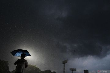 Seorang warga menggunakan payung saat hujan deras di Jakarta, Sabtu (15/11/2025). Badan Meteorologi, Klimatologi, dan Geofisika mengimbau masyarakat untuk mewaspadai potensi cuaca ekstrem yang diperkirakan terjadi selama sepekan hingga 20 November 2025 karena dipengaruhi perpaduan fenomena atmosfer yang memicu pertumbuhan awan hujan secara siginifikan di berbagai wilayah di Indonesia. ANTARA FOTO/Sulthony Hasanuddin/foc.
