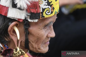 Tetua Adat Suku Dayak Kenyah Simson Imang menyaksikan tarian saat berlangsungnya Festival Adat Budaya Dayak Kenyah 2025 di Lamin Adat Pemung Tawai di Desa Budaya Pampang, Tanah Merah, Samarinda, Kalimantan Timur, Sabtu (21/6/2025). Desa Budaya Pampang dihuni oleh 50 persen Dayak Kenyah Lepoq Bakung sisanya beragam Suku Dayak Kenyah antara lain Kenyah Lepoq Kulit, Dayak Kenyah Lepoq Tukung, Dayak Bem, hingga Dayak Kenyah Lepoq Jalan yang memiliki mata pencaharian sebagai petani, berkebun hingga seniman dalam melestarikan budaya adat Dayak Kenyah. ANTARA FOTO/M Risyal Hidayat/agr