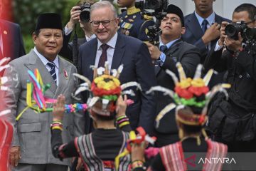 Presiden Prabowo Subianto (kiri) bersama Perdana Menteri Australia Anthony Albanese (kedua kiri) menyaksikan tarian tradisional saat kunjungan kenegaraan di Istana Merdeka, Jakarta, Jumat (6/2/2026). Kunjungan PM Australia Anthony Albanese tersebut untuk memperkuat hubungan kemitraan strategis kedua negara di berbagai bidang. ANTARA FOTO/Bayu Pratama S./wpa.