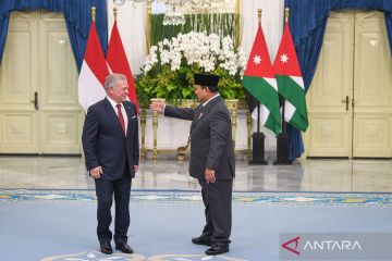 Presiden Prabowo Subianto (kanan) dan Raja Kerajaan Yordania Hasyimiah Abdullah II Ibnu Al Hussein (kiri) berjabat tangan dalam kunjungan kenegaraan di Istana Merdeka, Jakarta, Jumat (14/11/2025). Kunjungan Raja Yordania tersebut dalam rangka memperkuat hubungan bilateral dan kerja sama strategis antara Indonesia dan Yordania. ANTARA FOTO/Galih Pradipta/nym.