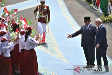 Presiden Prabowo Subianto (kedua kanan) bersama Presiden Brazil Luiz Inácio Lula da Silva (kanan) berjalan untuk memeriksa pasukan di Istana Merdeka, Jakarta, Kamis (23/10/2025). Presiden Prabowo Subianto menerima kunjungan Presiden Brazil Luiz Inácio Lula da Silva guna membahas isu-isu global dan bilateral termasuk penguatan kerja sama kedua negara di sejumlah bidang. ANTARA FOTO/Aditya Pradana Putra/tom.