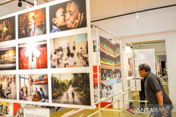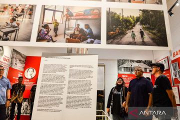 Pengunjung melihat karya foto yang dipajang pada pameran visual jurnalistik Haluan Merah Putih goes to Bandung di Museum Kota Bandung, Bandung, Jawa Barat, Jumat (14/11/2025). Pameran tersebut menampilkan 65 karya foto tunggal jurnalistik, empat foto cerita jurnalistik, enam berita infografis, empat tulisan jurnalistik dan empat video jurnalistik dari pewarta Perum LKBN ANTARA terkait satu tahun pencapaian pemerintahan Presiden Prabowo Subianto dan Wakil Presiden Gibran Rakabuming Raka. ANTARA FOTO/Novrian Arbi/nym.