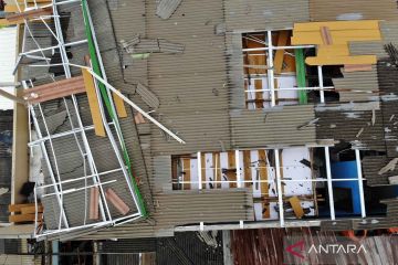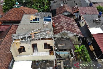 Foto udara atap rumah yang rusak akibat bencana angin puting beliung di Bojonggede, Kabupaten Bogor, Jawa Barat, Jumat (24/10/2025). Berdasarkan data dari Badan Penanggulangan Bencana Daerah (BPBD) Kabupaten Bogor sebanyak 20 lebih rumah warga rusak akibat angin puting beliung yang terjadi pada Jumat siang pukul 14.30 WIB. ANTARA FOTO/Yulius Satria Wijaya/nym.