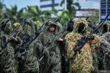 Prajurit pasukan khusus Sniper TNI melakukan defile saat gladi kotor HUT ke-80 TNI di Monas, Jakarta, Kamis (2/10/2025). Gladi kotor digelar dalam rangka persiapan HUT ke-80 TNI yang mengerahkan sekitar 140 ribu pasukan TNI pada 5 Oktober 2025. ANTARA FOTO/Sulthony Hasanuddin/foc.