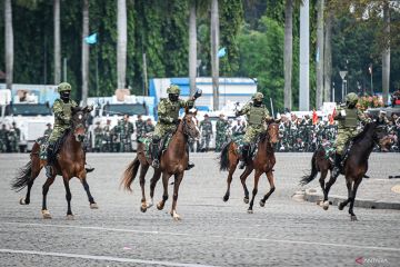 Prajurit Batalyon Kavaleri Berkuda melakukan demonstrasi serbuan berkuda saat gladi kotor HUT ke-80 TNI di Monas, Jakarta, Kamis (2/10/2025). Gladi kotor digelar dalam rangka persiapan HUT ke-80 TNI yang mengerahkan sekitar 140 ribu pasukan TNI pada 5 Oktober 2025. ANTARA FOTO/Sulthony Hasanuddin/foc.