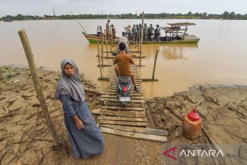 Pengendara sepeda motor dan warga antre untuk menaiki perahu saat akan menyeberangi Sungai Batanghari dari Desa Keranggan menuju Desa Berembang di Sekernan, Muaro Jambi, Jambi, Senin (20/10/2025). Menurut warga setempat sedikitnya 200 warga Sekernan yang berada di tepi Daerah Aliran Sungai (DAS) Batanghari masih menggunakan perahu untuk menyeberangi sungai terpanjang di Sumatera itu setiap harinya dengan tarif umum Rp7 ribu per motor pulang-pergi (PP) dan Rp5 ribu per motor PP untuk pelajar karena tidak adanya jembatan penghubung. ANTARA FOTO/Wahdi Septiawan/tom.