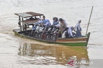 Pengendara sepeda motor dan warga menyeberangi Sungai Batanghari menggunakan perahu dari Desa Keranggan menuju Desa Berembang di Sekernan, Muaro Jambi, Jambi, Senin (20/10/2025). Menurut warga setempat sedikitnya 200 warga Sekernan yang berada di tepi Daerah Aliran Sungai (DAS) Batanghari masih menggunakan perahu untuk menyeberangi sungai terpanjang di Sumatera itu setiap harinya dengan tarif umum Rp7 ribu per motor pulang-pergi (PP) dan Rp5 ribu per motor PP untuk pelajar karena tidak adanya jembatan penghubung. ANTARA FOTO/Wahdi Septiawan/tom.