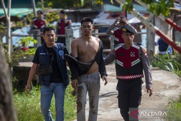 Petugas kepolisian dan Badan Narkotika Nasional (BNN) mengamankan seorang warga yang berusaha kabur saat razia gabungan di Kampung Madani Bersih Narkoba (Bersinar), Muka Kuning, Batam, Kepulauan Riau, Jumat (7/11/2025). Dalam razia gabungan BNNP Kepri bersama Polri, TNI, dan Satpol PP tersebut berhasil mengamankan 36 orang warga yang positif mengkonsumsi narkotika setelah dilakukan tes urine. ANTARA FOTO/Teguh Prihatna/agr