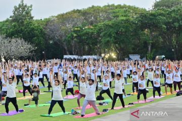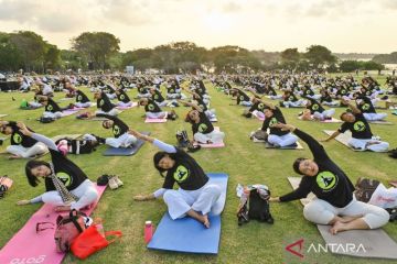 Peserta mengikuti yoga bersama di Pulau Peninsula, The Nusa Dua, Badung, Bali, Sabtu (21/6/2025). Kegiatan yang diikuti sekitar 1.000 orang peserta tersebut diselenggarakan untuk merayakan Hari Yoga Internasional 2025. ANTARA FOTO/Fikri Yusuf/agr