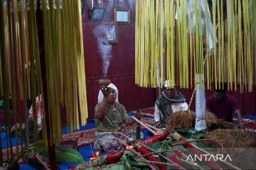 Seorang Bissu melakukan ritual Masere' menggunakan baku panampa dalam upacara adat mappalili di Bola Arajang Bissu, Kabupaten Pangkep, Sulawesi Selatan, Senin (10/11/2025). Ritual yang menandai dimulainya musim tanam padi tersebut merupakan tradisi turun-temurun masyarakat Segeri sebagai bentuk permohonan restu kepada penjaga alam dan leluhur agar hasil panen melimpah serta terhindar dari bencana. ANTARA FOTO/Hasrul Said/rwa.
