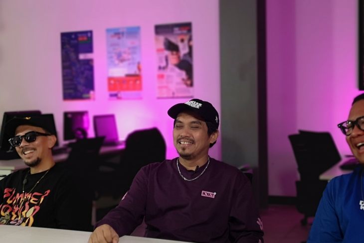 Personel Rocket Rockers Aska Pratama (tengah), Bisma Aria Nugraha (kiri), dan Khrisna Bharata "Ozom" (kanan) mengunjungi ANTARA Heritage Center di Pasar Baru, Jakarta, Rabu (5/11/2025). ANTARA/Abdu FaisalBaca juga: Rocket Rockers "Reuni" dengan Ucay dan Lowp