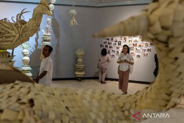 Pengunjung mengamati instalasi seni janur karya Sigit Paripurno yang dipamerkan di Taman Budaya Jawa Tengah (TBJT) Kota Solo, Jawa Tengah, Selasa (14/10/2025). Pameran tersebut digelar sebagai upaya mempromosikan janur sebagai seni anyaman tradisi Indonesia sekaligus produk kerajinan yang bernilai ekonomi dan memiliki potensi daya tarik wisata. ANTARAFOTO/Maulana Surya/sgd