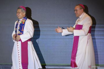 Ketua Konferensi Waligereja Indonesia (KWI) Mgr. Antonius Subianto Bunjamin (kiri) berjalan bersama Duta Besar Takhta Suci Vatikan untuk Indonesias Mgr. Piero Pioppo saat pembukaan Sidang Agung Gereja Katolik Indonesia (SAGKI) 2025 di Jakarta, Senin (3/11/2025). Sidang lima tahunan Gereja Katolik yang mempertemukan para uskup, imam, biarawan-biarawati, dan kaum awam dari seluruh Indonesia ini mengusung tema Berjalan Bersama sebagai Peziarah Pengharapan.. ANTARA FOTO/Hafidz Mubarak A/foc.