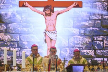 Ketua Konferensi Waligereja Indonesia (KWI) Mgr. Antonius Subianto Bunjamin (tengah) memimpin misa saat pembukaan Sidang Agung Gereja Katolik Indonesia (SAGKI) 2025 di Jakarta, Senin (3/11/2025). Sidang lima tahunan Gereja Katolik yang mempertemukan para uskup, imam, biarawan-biarawati, dan kaum awam dari seluruh Indonesia ini mengusung tema Berjalan Bersama sebagai Peziarah Pengharapan. ANTARA FOTO/Hafidz Mubarak A/foc.