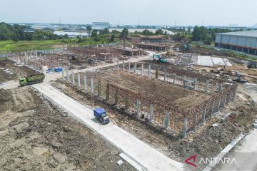 Foto udara suasana proyek pembangunan Sekolah Rakyat tahap II di Sukamahi, Cikarang, Kabupaten Bekasi, Jawa Barat, Senin (27/4/2026). Pemerintah menargetkan penyelesaian pembangunan 101 unit Sekolah Rakyat permanen tahap dua di berbagai wilayah Indonesia itu rampung pada 20 Juni 2026 guna menyambut tahun ajaran baru 2026/2027. ANTARA FOTO/Darryl Ramadhan/nym.