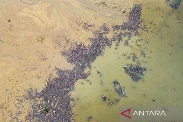 Foto udara sampah kayu gelondongan yang hanyut di Danau Singkarak di Nagari Muaro Pingai, Kabupaten Solok, Sumatera Barat, Minggu (30/11/2025). Sampah kayu gelondongan tersebut menumpuk di sepanjang jalur banjir bandang dalam beberapa hari terakhir. ANTARA FOTO/Wawan Kurniawan/tom.