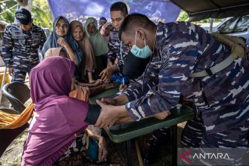 Satgas Penanggulangan Bencana Alam TNI AL memeriksa kesehatan warga di Desa Kuala Cangkoy, Aceh Utara, Aceh, Senin (8/12/2025). Satgas TNI AL menurunkan 85 prajurit beserta dokter spesialis dan mendirikan rumah sakit lapangan untuk memberikan pelayanan kesehatan kepada warga terdampak bencana alam di wilayah Aceh Utara. ANTARA FOTO/Bayu Pratama S/YU